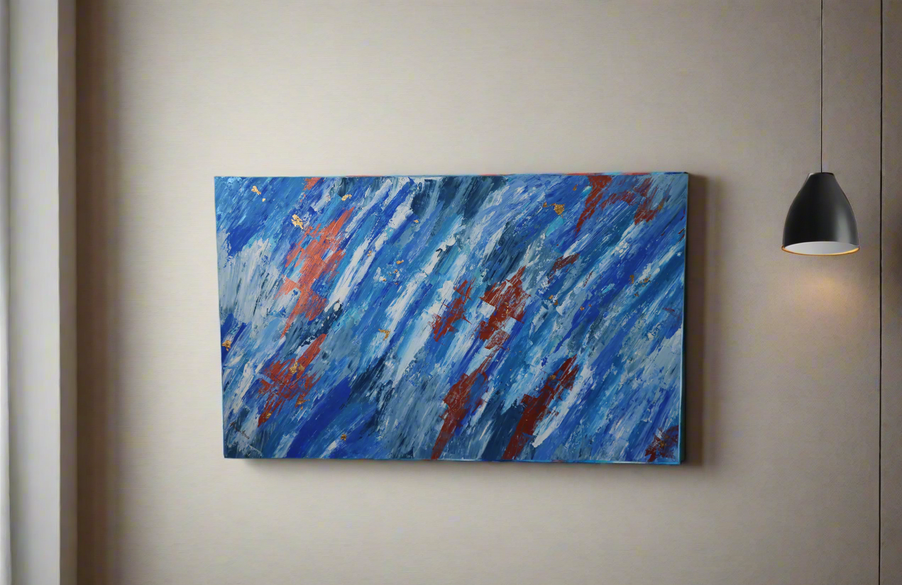 This piece channels the fierce grace of Tanjiro Kamado’s Water Breathing techniques from Demon Slayer. The bold streaks of blue, white, and crimson mimic the fluid, sweeping arc of a sword slash, frozen in time. Abstract in form yet full of motion, this canvas evokes the power, discipline, and serenity of combat.