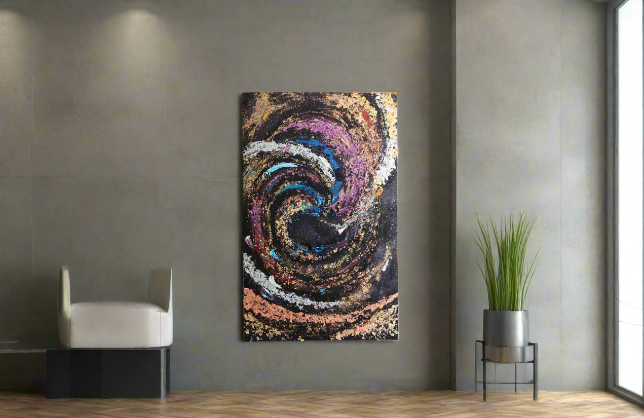Created while immersed in the haunting score of Interstellar, this piece explores the chaotic beauty of a black hole consuming all matter and light. Textured with multicolored metallic flakes, the painting reflects the last remnants of energy being pulled into oblivion—vivid, swirling, and collapsing into darkness.