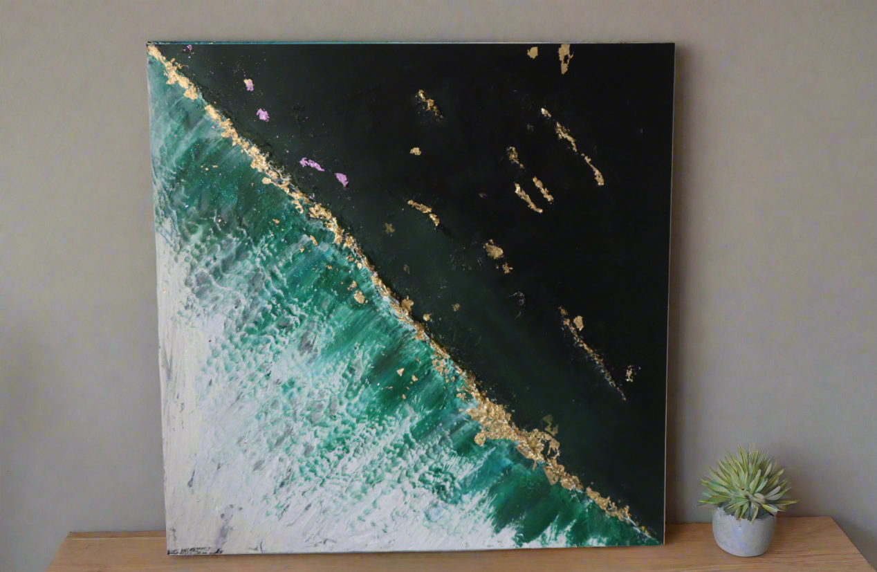 36inx36in and 1 1/2 inches thick, acrylic on canvas with foil.